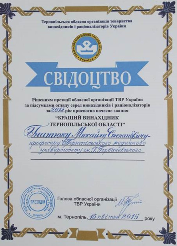 Щороку Тернопільська обласна організація товариства винахідників і раціоналізаторів України проводить конкурс на присвоєння звання «Кращий винахідник, раціоналізатор Тернопільської області». За підсумками винахідницької роботи в університеті за 2014 рік кращим винахідником визнано доктора медичних наук, завідувача кафедри оперативної хірургії та топографічної анатомії Михайла Гнатюка. Нещодавно від отримав свідоцтво щодо присвоєння йому почесного звання «Кращого винахідника Тернопільської області».