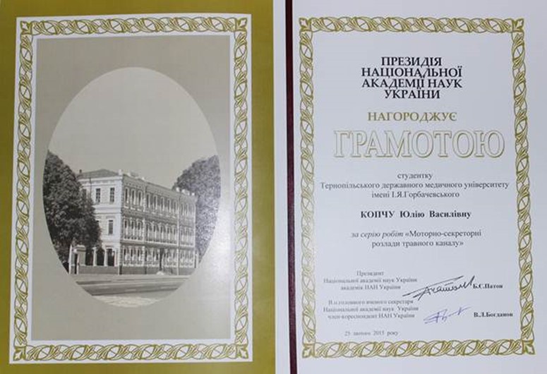 Нещодавно студентка 4 курсу медичного факультету Тернопільського державного медичного університету імені І.Горбачевського Юлія Копча отримала грамоту Президії Національної академії наук України за серію робіт «Моторно-секреторні розлади травного тракту».