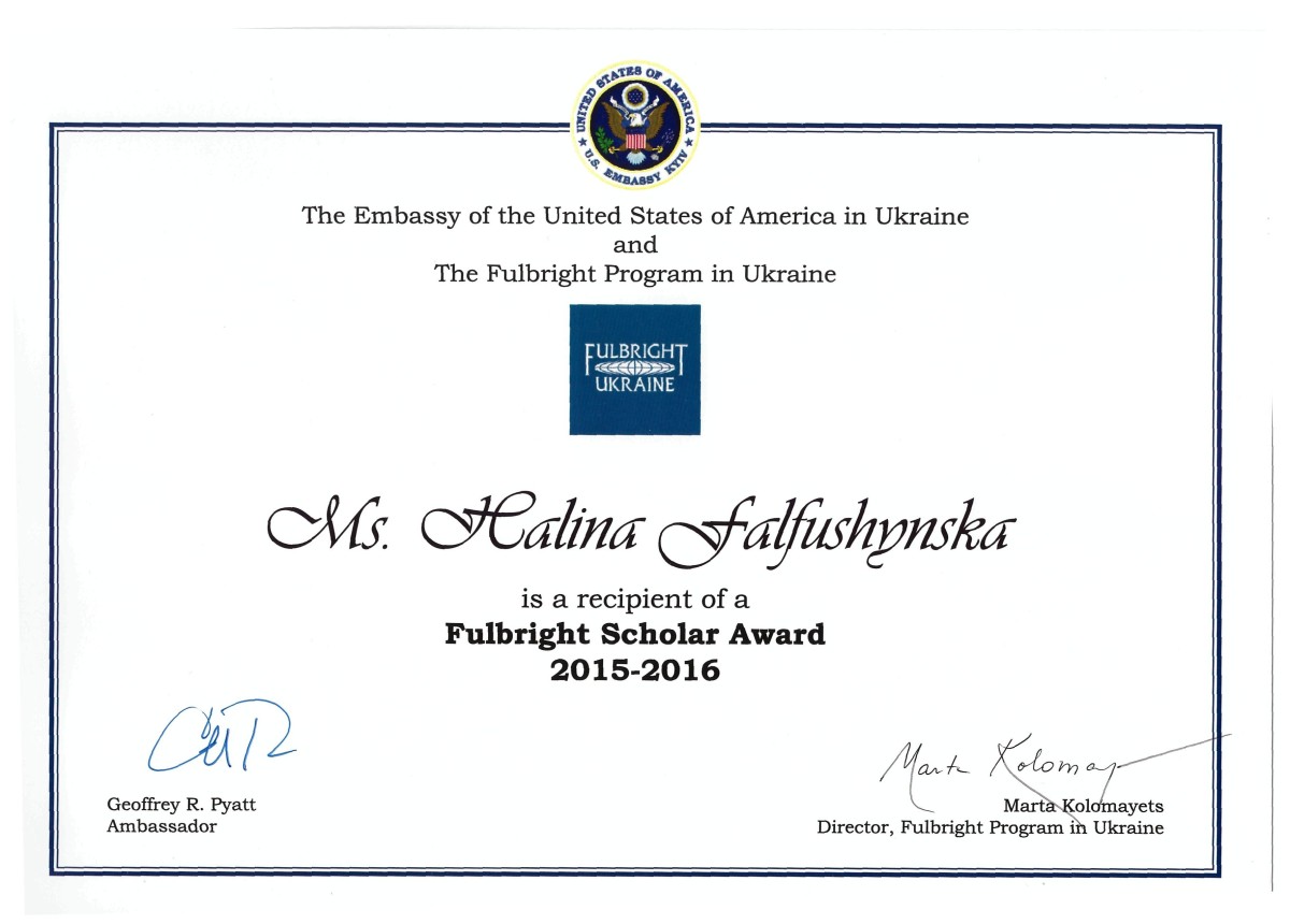 Нещодавно у Посольстві США в Україні відбулася урочиста подія вручення сертифікатів переможцям грантових програм академічних обмінів імені Фулбрайта. Одним із переможців стала завідувач кафедри загальної хімії фармацевтичного факультету Тернопільського державного медичного університету імені І.Горбачевського. доктор біологічних наук Галина Фальфушинська. Саме в рамках програми «Fulbright Scholar Program» науковець ТДМУ упродовж дев’яти місяців буде виконувати дослідження за проектом «INTEGRATIVE ASSESSMENT OF THE ENVIRONMENTAL IMPACTS OF HYPOXIA AND NANOPOLLUTION ON MARINE MUSSELS USING PHYSIOLOGICAL AND MOLECULAR MARKERS» на базі Університету Північної Кароліни в Шарлоті. Передумовою для отримання гранту стала співпраця між колективами наукових інституцій України та США, результати якої опубліковані у двох статтях з імпакт-фактором більше 3 та низці Міжнародних (PRIMO, EUROTOX) та національних конференцій та симпозіумах.