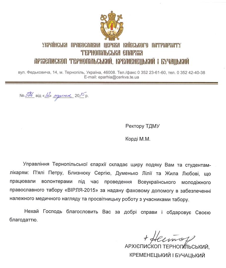 Архієпископ Тернопільський, Кременецький і Бучацький Нестор 12 серпня цього року вручив ректору Тернопільського державного медичного університету імені І.Горбачевського, професору Михайлу Корді подяку за допомогу в організації медичної служби під час роботи Всеукраїнського молодіжного православного табору “Вірля-2015”.