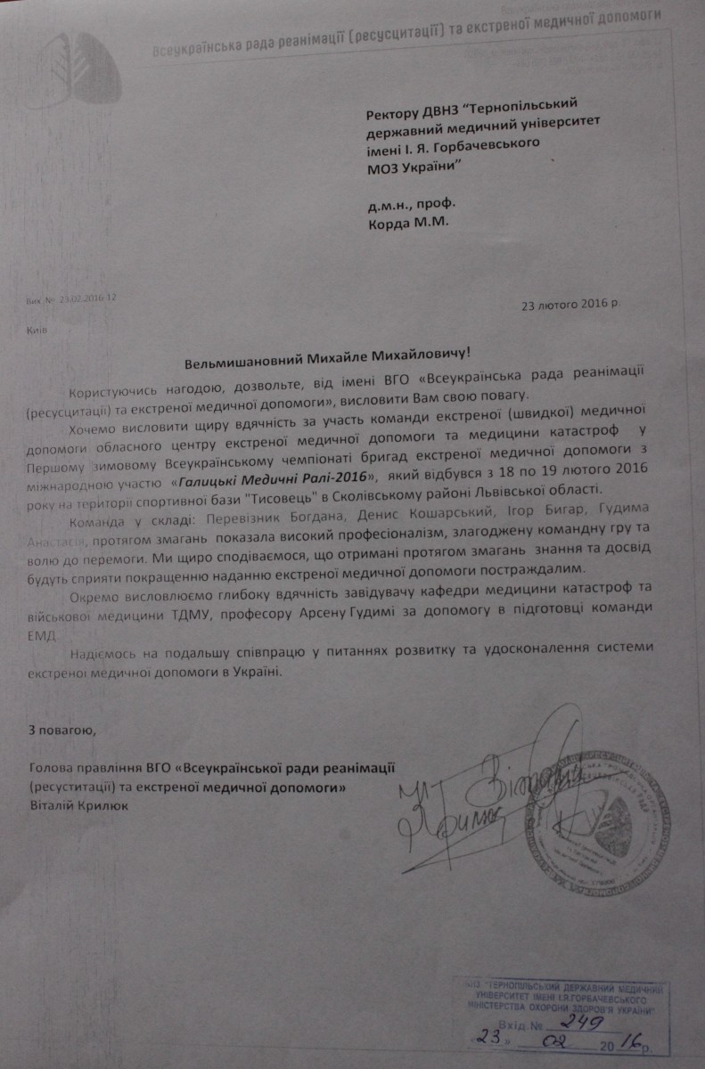 На адресу Тернопільського державного медичного університету імені І.Горбачевського надійшла подяка від Всеукраїнської ради реанімації та екстреної медичної допомоги за участь нашої команди у цих змаганнях.