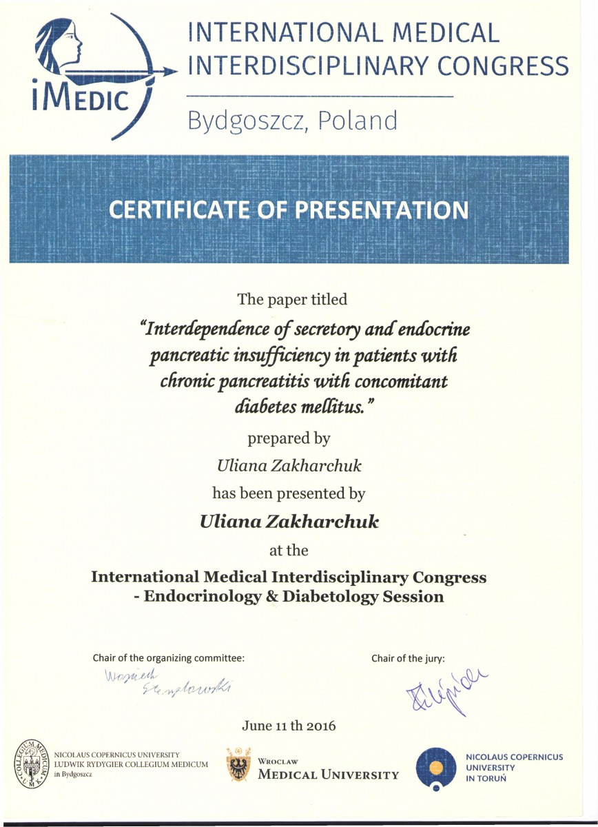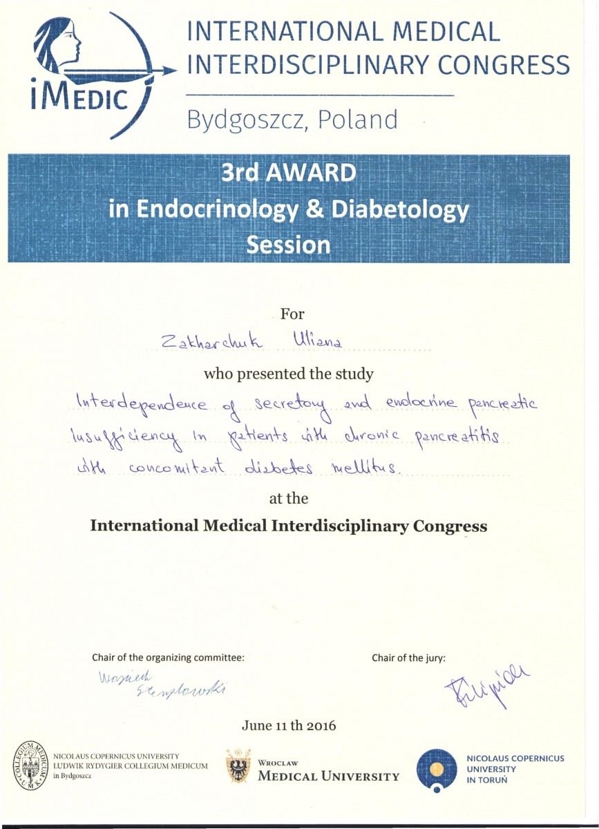 Нещодавно у місті Бидгощ (Польща) відбувся Міжнародний конгрес молодих вчених (I MEDIC 2016, Bydgoszcz). Клінординатор кафедри первинної медико-санітарної допомоги та загальної практики-сімейної медицини Тернопільського державного медичного університету імені І.Горбачевського Уляна Захарчук взяла участь у цьому заході. «I MEDIC 2016» був організований завдяки співпраці трьох ВНЗ Польщі: Collegium Medicum in Bydgoszcz, Nicolaus Copernicus in Toruń and Medical University of Wrocław. У ньому взяли участь як студенти, так і представники післядипломної освіти – молоді вчені до 35 років.