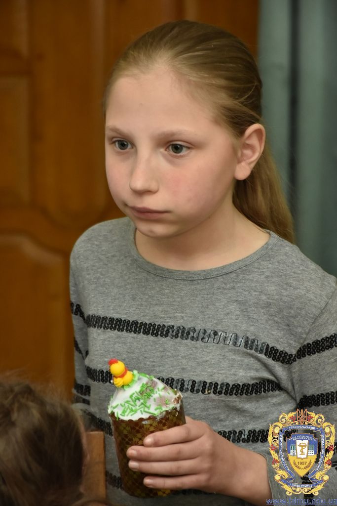 На завершення зустрічі хлопчики і дівчатка виконали улюблену пісню, яку підспівувала вся зала. А студенти роздали дітям великодні смаколики і, зокрема, гарно прикрашені пасочки.