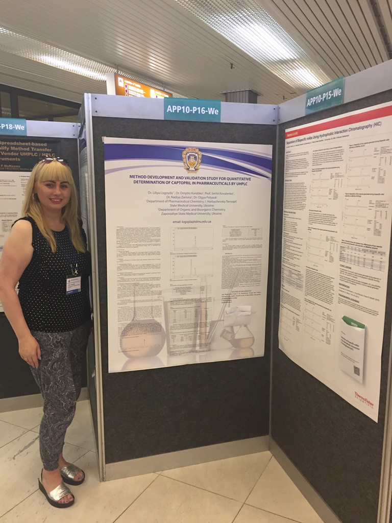 Наукова робота доцента кафедри фармацевтичної хімії Лілії Логойди була представлена у вигляді доповіді та постеру. За результатами роботи симпозіуму HPLC 2017 доповідь та постер L. Logoyda, D. Korobko, S. Kovalenko, N. Zarivna, O. Polyauk (секція – Applications 10 Recent advances in (bio)pharmaceuticals) на тему «Method Development and Validation Study for Quantitative Determination of Captopril in Pharmaceuticals by UHPLC» були відзначені дипломами.
