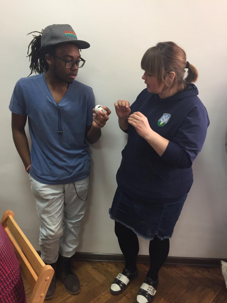 Майстер-клас проводили члени громадської організації «Спілка української молоді». Вони розповіли іноземцям про історію символів, якими традиційно оздоблюються писанки, про спеціальні фарби, а також про те, які засоби та техніки використовуються в різних регіонах України. Кожен учасник майстер-класу власноруч зробив писанку згідно з традиційною методикою – за допомогою воску та фарб.