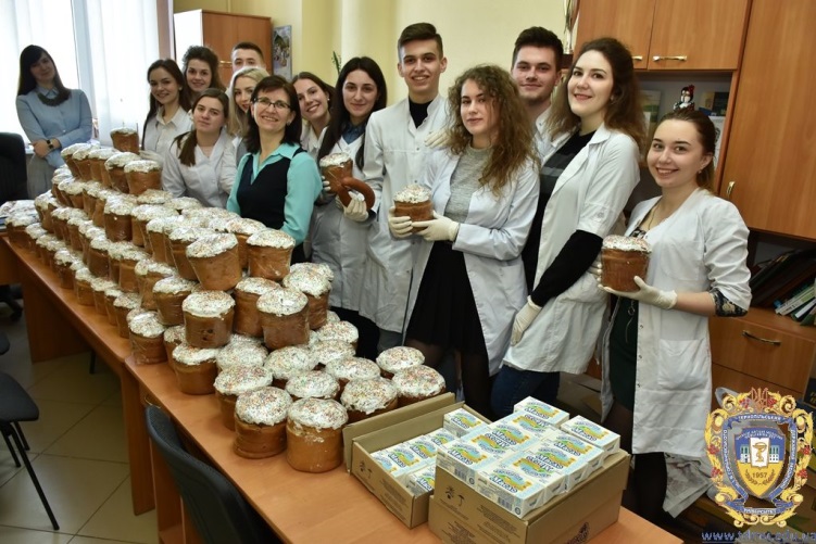 Студенти нашого університету дбайливо сформували тридцять великодніх кошиків для воїнів нульової лінії фронту, які бережуть наші кордони у Луганській та Донецькій областях. Окрім того, з коштів, які зібрав хор Тернопільського медичного університету під час колядування, на 5 тисяч гривень було придбано необхідну кількість ліків. За гроші профкому ТДМУ для укомплектування великодніх кошиків закуплено шинку, ковбасу, паски, бочок.