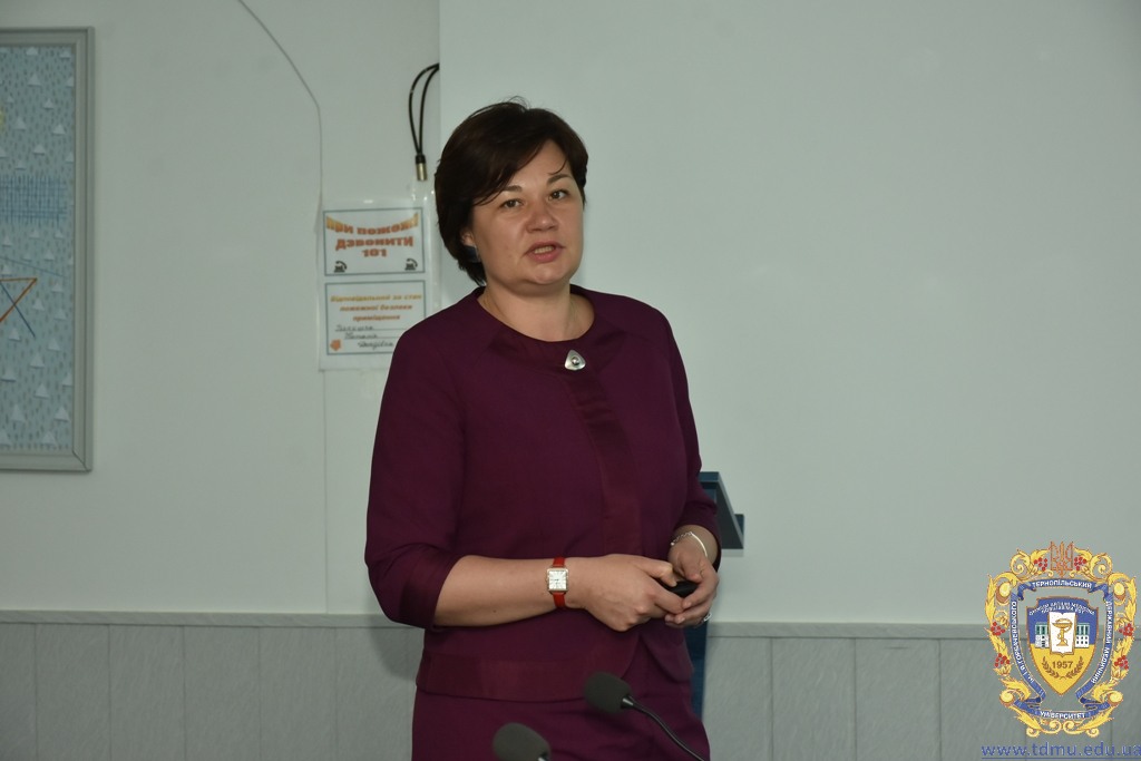 Декан стоматологічного факультету, доц. Бойцанюк С.І. розповіла про історію створення кафедри терапевтичної стоматології, її досягнення і перспективи розвитку. Вона зазначила, що кафедра терапевтичної стоматології за час становлення виросла в потужний науковий та навчально-педагогічний підрозділ університету, який виконує всі основні завдання, поставлені перед нею керівництвом вишу.