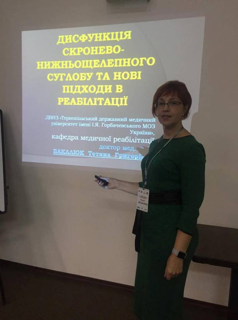 Доцент кафедри медичної реабілітації Тетяна Бакалюк доповіла про результати, отримані під час виконання наукової роботи «Дисфункція скронево-нижньощелепного суглобу і методи її корекції».