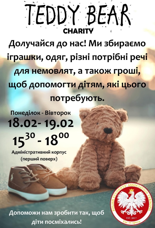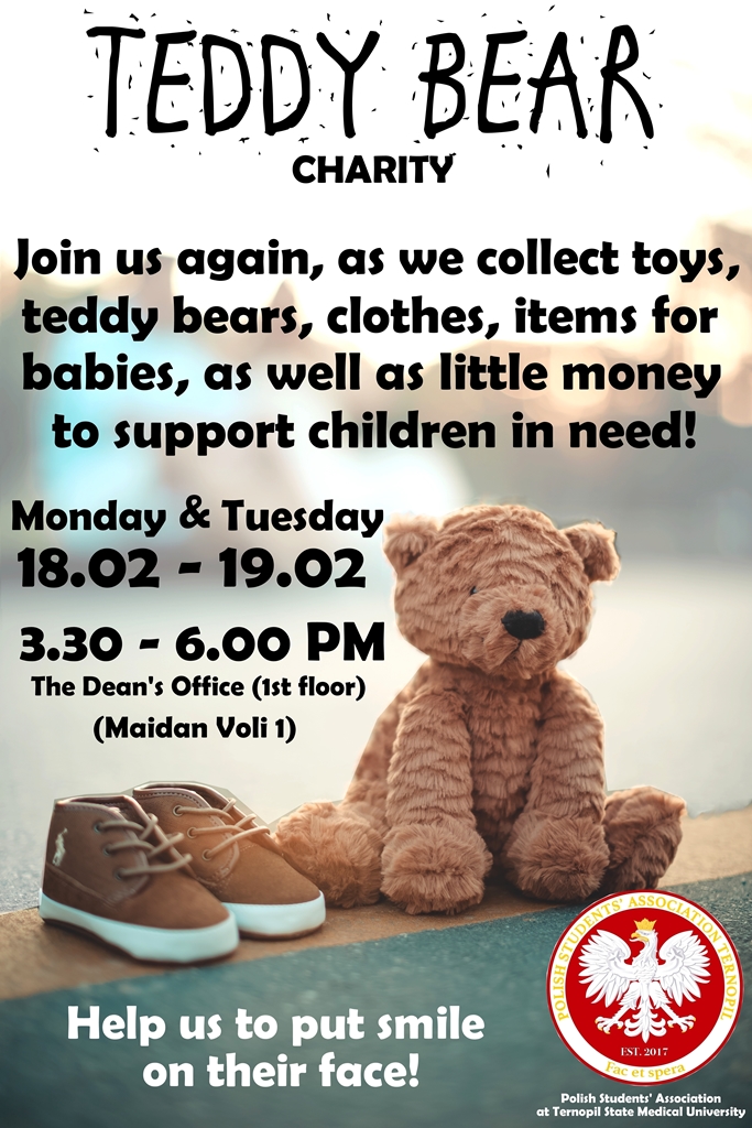 18 та 19 лютого 2019 року у вестибюлі адміністративного корпусу ТДМУ відбулася благодійна акція «Teddy bear charity», під час якої студенти збирали іграшки, одяг і гроші для сімей та дітей, які потребують допомоги.