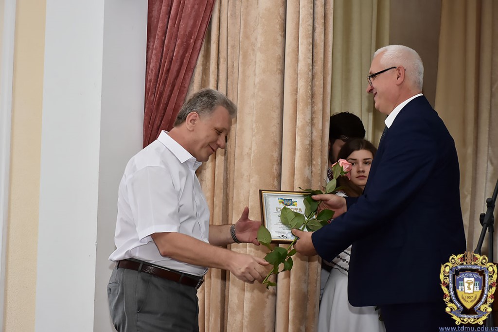 Подяками міського голови та цінними подарунками представники ТНМУ були відзначені під час загальноміських урочистостей, зокрема Запорожан Степан Йосипович – проректор з лікувальної роботи, доктор медичних наук, професор кафедри загальної хірургії; Банадига Наталія Василівна – доктор медичних наук, професор, завідувач кафедри педіатрії навчально-наукового інституту післядипломної освіти.