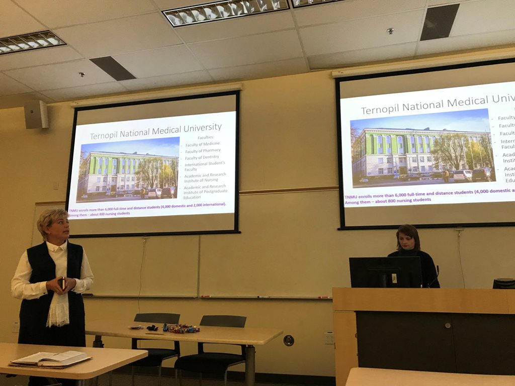 Ястремська С.О. та Мазур Л.П. виступили перед викладачами медсестринського факультету університету МакЮена з інформацією про Тернопільський національний медичний університет, ННІ медсестринства, про програми, за якими навчаються студенти та методикою проведення навчання як для студентів університету, так і для здобувачів післядипломної освіти.
