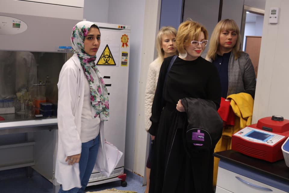Олена Володимирівна ознайомилася з роботою кафедри мікробіології та імунології та зустрілася з очільницею кафедри, заступником декана фармацевтичного факультету, професоркою Rasha Barouh. Завданням викладачів та їх асистентів є поширення основних знань з мікробіології, молекулярної біологія, промислової біотехнології, мікробної генетики, імунології, паразитології, біотехнології, про мікробні захворювання і їх лікування, про контроль стерильної в фармації. Працівники кафедри працюють над питаннями молекулярної біології, біотехнології, механізмами антибіотикорезистентності, імунології. У сферу їх інтересів входить вивчення впливу антибактеріальних препаратів на мікроорганізми, розвиток їх стійкості до антибіотиків та визначення шляхів підвищення їх ефективності; виділення та порівняння мікробів із різних клінічних та екологічних джерел; допомога дослідникам у галузі фармацевтичної, органічної, аналітичної та лікарської хімії у з’ясуванні  хімічної структури органічних та природних матеріалів за допомогою пристрою NMR з метою розробки та відкриття лікарських засобів. Майбутні магістри проводять власні дослідження патогенних бактерій, грибів та вірусів (зокрема бактеріофагів), та розробляють схеми виробництва важливих фармацевтичних продуктів під керівництвом викладачів.