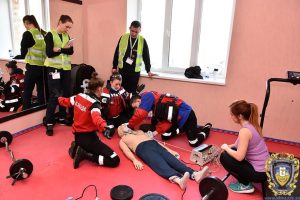 2. «ЧП» – конкурс з масовим ураженням, який проходив на території унікальної архітектурної пам’ятки – замку в Білокриниці. Там зараз знаходиться Кременецький лісотехнічний коледж. Історія замку, а тепер – палацу, відновленого в неоготичному стилі, починається у XVI ст. Дотепер вздовж будівлі протягається підвальне приміщення чималих розмірів з склепінчастим дахом. За легендою, в одній з навчальних аудиторій провалилася підлога й частина учнів опинилася в завалі. Інша безпечно покинула аудиторію разом з викладачем. На місці працюють рятувальники та поліція. На цей виклик прибуло відразу 2 бригади ЕМД. Постраждалих рятувлаьники почергово виносили в безпечну зону, де працювали медики. Необхідно було організувати надання допомоги, провести медичне сортуваня та надати допомогу пріоритетним постраждалим. На цьому конкурсі оцінювалися наявність у команд засобів для проведення сортування, якими вони звикло користуються у своїх Центрах ЕМД, комунікація, командна взаємодія, уміння провести медичнне сортування, визначити пріортитетних постражадлих та уміння заповнити сортувальний талон.