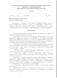 Відповідно до рішення позачергового засідання регіональної комісії з питань техногенно-екологічної безпеки та надзвичайних ситуацій при Тернопільській облдержадміністрації, яке відбулося 11 березня 2020 року, в Тернопільському національному медичному університеті призупинено навчальний процес. Такі заходи вжито згідно з урядовими рішеннями, яких необхідно дотримуватись через загрозу епідемії коронавірусної інфекції в Україні та для недопущення поширення COVID-19. Деальніше у наказі ТНМУ.