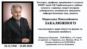 За межу вічності відійшов Мирослав Миколайович Закалюжний – ветеран університету, колишній завідувач кафедри іноземних мов, доцент Тернопільського національного медичного університету імені І.Горбачевського.
