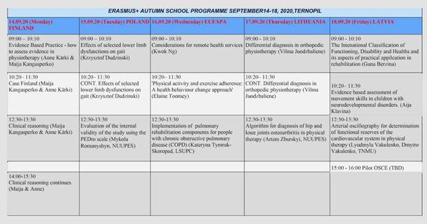 У рамках Програми Європейського Союзу Еразмус+ «Innovative Rehabilitation Education – Introduction of new master degree programs in Ukraine 2018-2021» REHAB 14-18 вересня 2020 року Тернопільським національним медичним університетом імені І.Горбачевського організовано та проведено Осінні школи. До їх програми увійшли дистанційні лекції та майстер-класи провідних європейських фахівців фізичної терапії з Латвійської академії спортивної освіти (Рига, Латвія), Європейської федерації адаптованої фізичної активності (EUFAPA), Університету прикладних наук (Порі, Фінляндія), Академії фізичного виховання імені Йозефа Пілсудського (Варшава, Польща), Литовського університету спорту (Каунас, Литва), Національного університету фізичного виховання і спорту (Київ, Україна), Львівського державного університету фізичної культури імені Боберського (Львів, Україна).