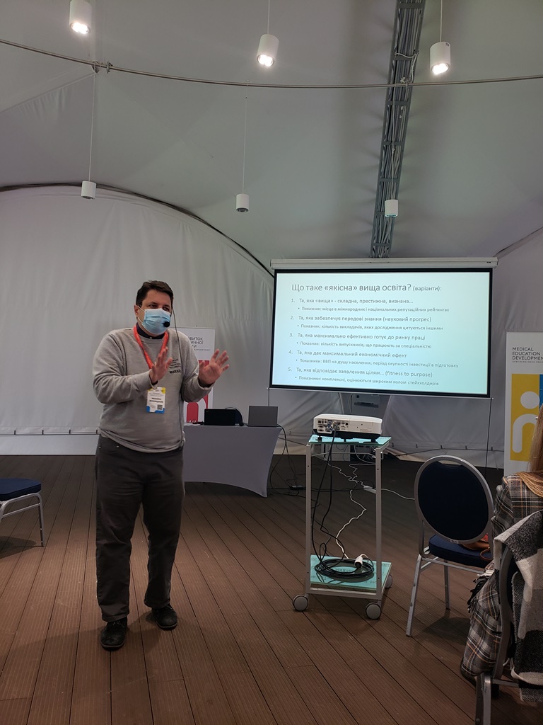 Після вітального слова Мартіна Рааба, спеціаліста з громадського здоров’я Швейцарського інституту громадського здоров’я та тропічної медицини (Swiss TPH), лідера україно-швейцарського проекту «Розвиток медичної освіти», учасники прослухали доповідь Андрія Ткаченка (НМАПО) – консультанта проекту, в якій було висвітлено результати аналізу наявних потужностей і досвіду пілотних ЗВО в симуляційному навчанні та обговорення напрямків подальшої співпраці.