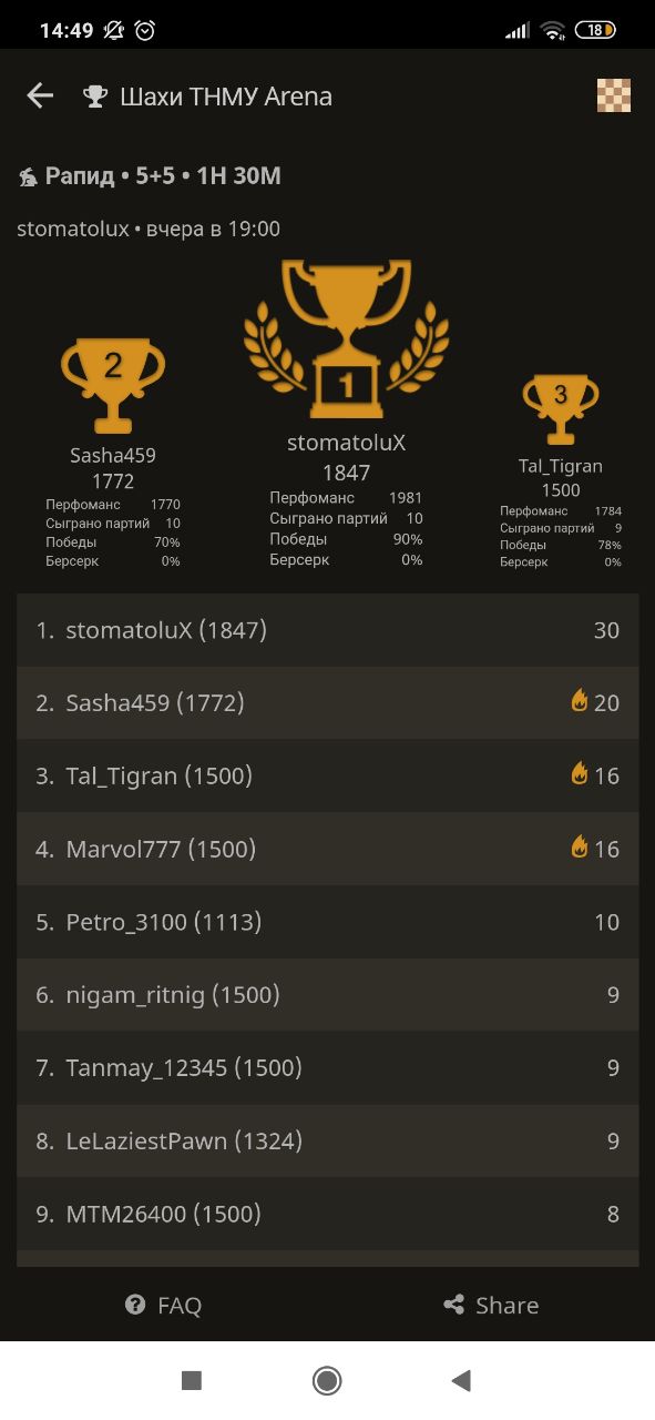 У неділю, 15 листопада 2020 року, о 19.00 відбувся шаховий турнір «ТНМУ Арена». Загалом взяли участь 22 особи. Турнір проводився в онлайн-режимі. Упродовж 90 хвилин змагань було зіграно 57 партій та зроблено 3223 ходи. У напруженій боротьбі місця розподілились наступним чином: