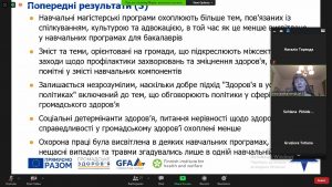 У зустрічі брали участь міжнародні експерти проєкту: професор Тіїна Лаатійкайнен – керівник Спільного центру ВООЗ з профілактики неінфекційних захворювань, зміцнення здоров’я та моніторингу у Фінляндії та пан Олаф Горстіч – доцент, старший експерт проєкту з розробки тренінгових модулів зі спеціальності громадське здоров’я. Експерти представили детальний огляд національних освітніх програм за спеціальністю громадське здоров’я (магістр, бакалавр) та дали рекомендації щодо їх покращення згідно з переліком основних компетенцій фахівців громадського здоров’я Асоціації учбових закладів громадського здоров’я в Європейському регіоні (ASPHER).