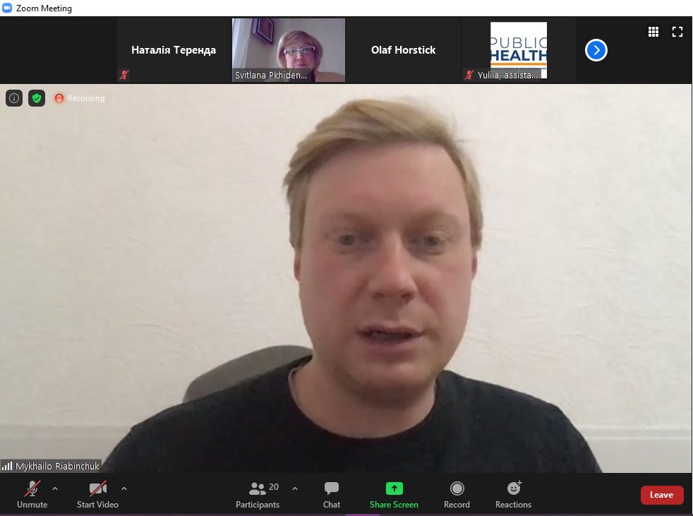 У зустрічі брали участь міжнародні експерти проєкту: професор Тіїна Лаатійкайнен – керівник Спільного центру ВООЗ з профілактики неінфекційних захворювань, зміцнення здоров’я та моніторингу у Фінляндії та пан Олаф Горстіч – доцент, старший експерт проєкту з розробки тренінгових модулів зі спеціальності громадське здоров’я. Експерти представили детальний огляд національних освітніх програм за спеціальністю громадське здоров’я (магістр, бакалавр) та дали рекомендації щодо їх покращення згідно з переліком основних компетенцій фахівців громадського здоров’я Асоціації учбових закладів громадського здоров’я в Європейському регіоні (ASPHER).