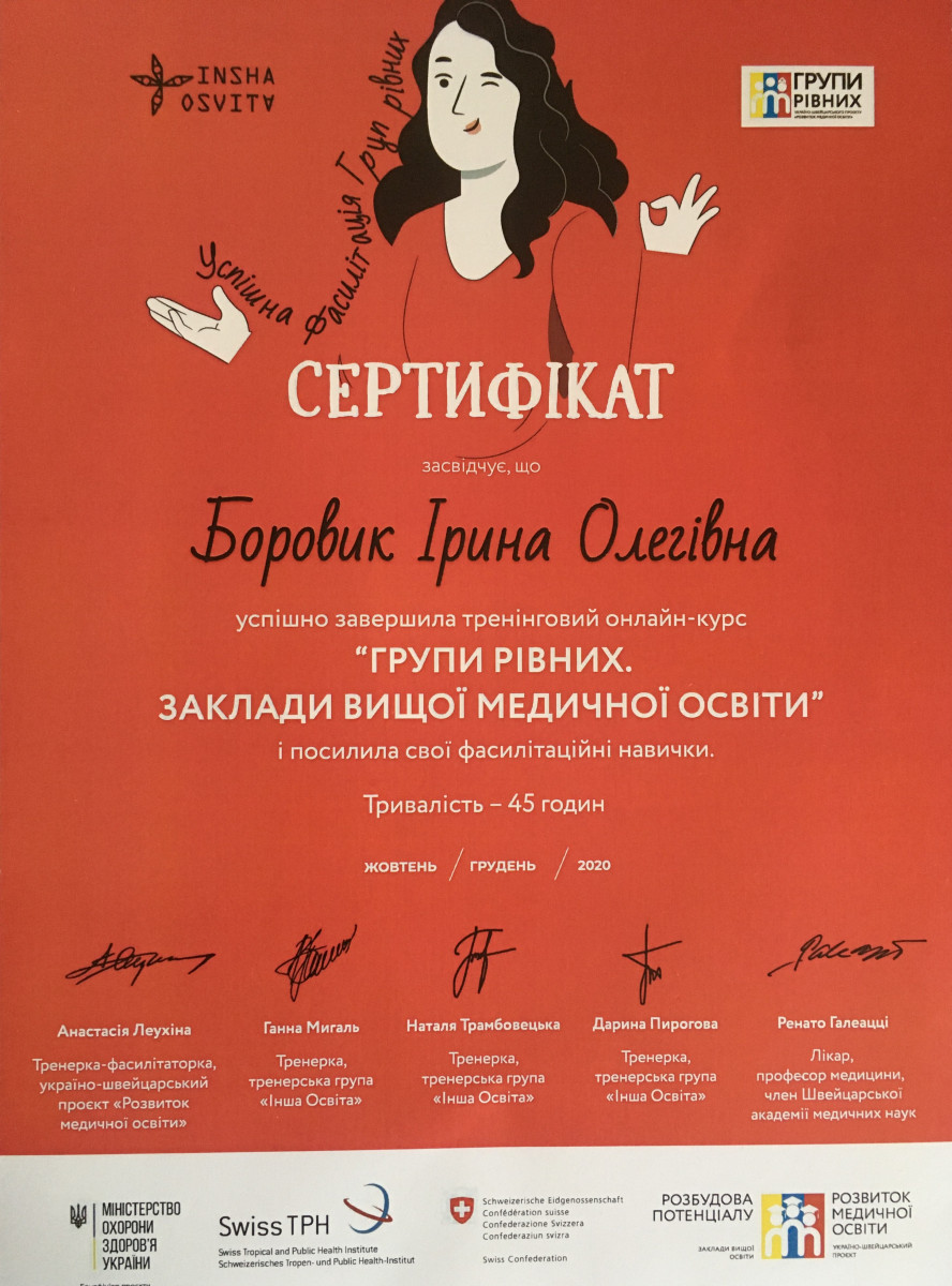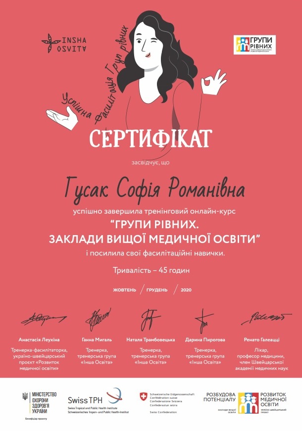 З 12 жовтня до 27 грудня 2020 року у рамках Україно-швейцарського проєкту «Розвиток медичної освіти» відбувся дистанційний курс-тренінг фасилітаторів груп рівних, у якому взяли участь викладачі Тернопільського національного медичного університету Оксана Сидоренко, Софія Гусак, Ірина Боровик та Наталія Галіяш.
