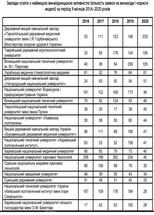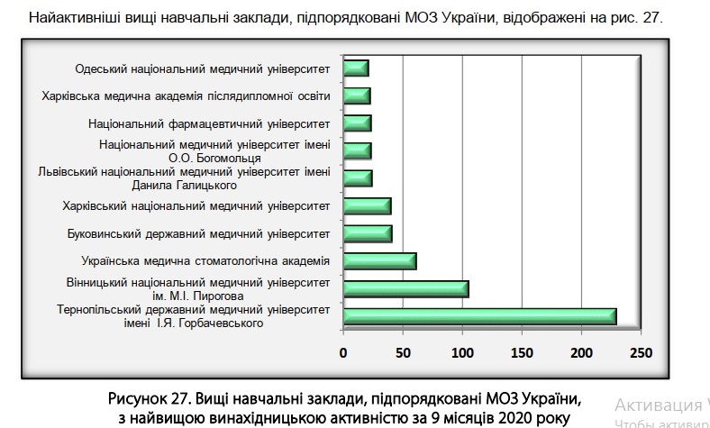 Тернопільський національний медичний університет посів перше місце серед вишів України щодо винахідницької активності у 2020 році. Минулого року ТНМУ подав 229 заявок на винаходи і корисні моделі. Ця кількість в п’ять разів перевищує показники 2016 року. Тоді було подано лише 53 заявки.