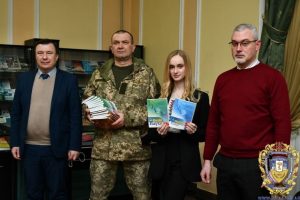 Студентка медичного факультету Надкевич А.Ю. та учасник бойових дій , волонтер і голова Всеукраїнської громадської організації «Закінчимо війну» Ліпянін Сергій Богданович передали посібники директору університетської бібліотеки Проців Олені Ярославівні.
