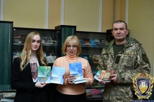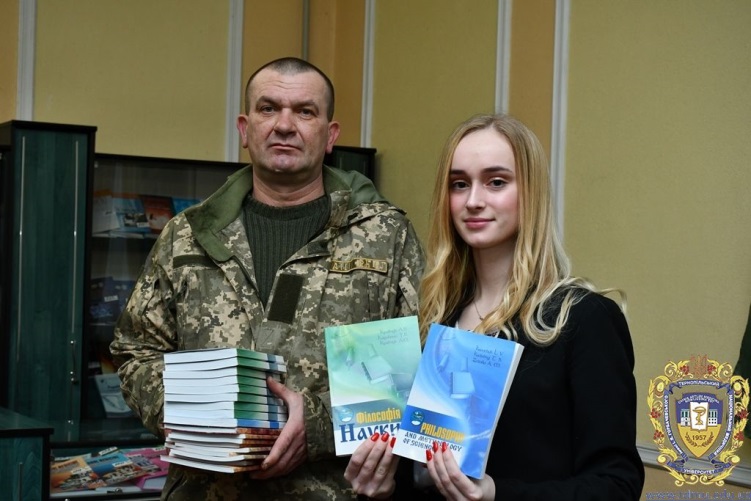Студентка медичного факультету Надкевич А.Ю. та учасник бойових дій , волонтер і голова Всеукраїнської громадської організації «Закінчимо війну» Ліпянін Сергій Богданович передали посібники директору університетської бібліотеки Проців Олені Ярославівні.
