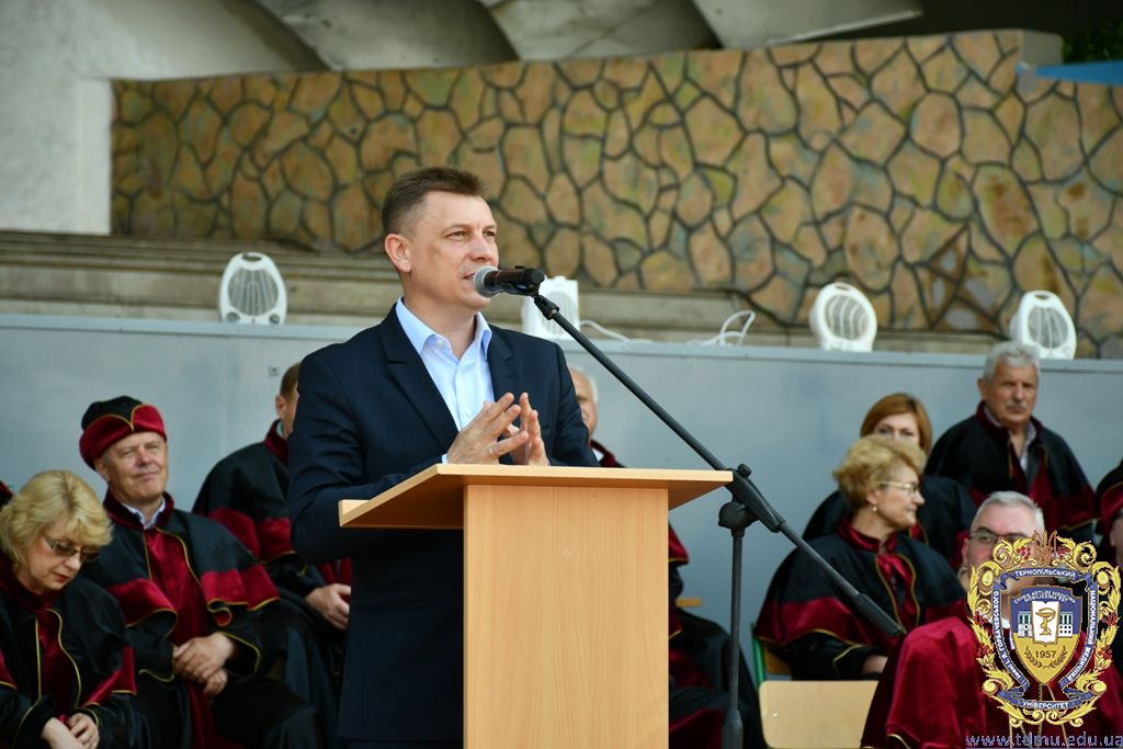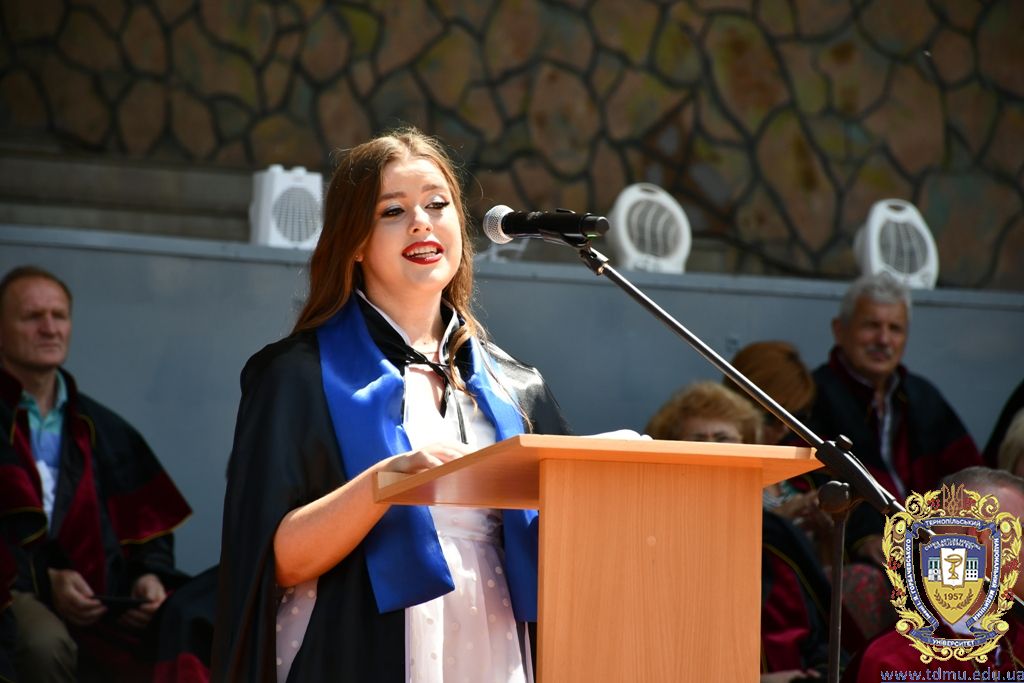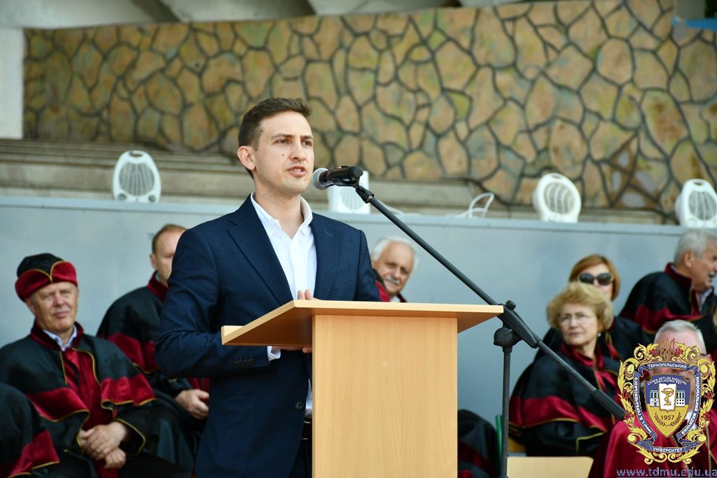 «Молоді, перспективні, розумні, сповнені життєвої енергії та наснаги будувати українську державу. Шановні випускники, майбутні медики, лікарі! Від імені голови та депутатського корпусу Тернопільської обласної ради вітаю вас з цим святом. Ви обрали благородний, але нелегкий шлях. Ви обрали шлях служіння людям! Адже медик – це одна з найвідповідальніших професій. Медик – це професія, дарована Богом. Дивлячись сьогодні на вас мене переповнює гордість і вдячність за те, що перед собою бачу молодих людей, в яких є майбутнє, а, отже, є майбутнє в України. Висловлюю вдячність викладацькому складу за підготовку таких професійних фахівців, які, переконаний, принесуть державі не одне визнання. Дорогі випускники, щиро бажаю вам міцного здоров`я, доброї долі, терпіння, благополуччя, успіху та професійних здобутків. Завжди йдіть вперед і пам’ятайте: життя й здоров’я людини – найголовніші цінності, а ви – гаранти їх збереження. Успіхів Вам», – побажав перший заступник голови Тернопільської обласної ради Володимир Болєщук.