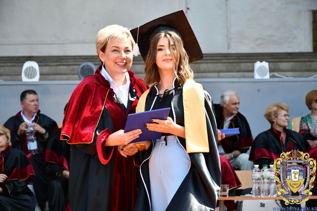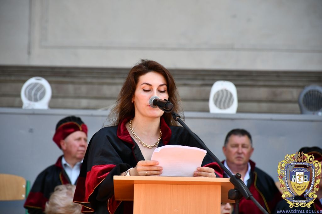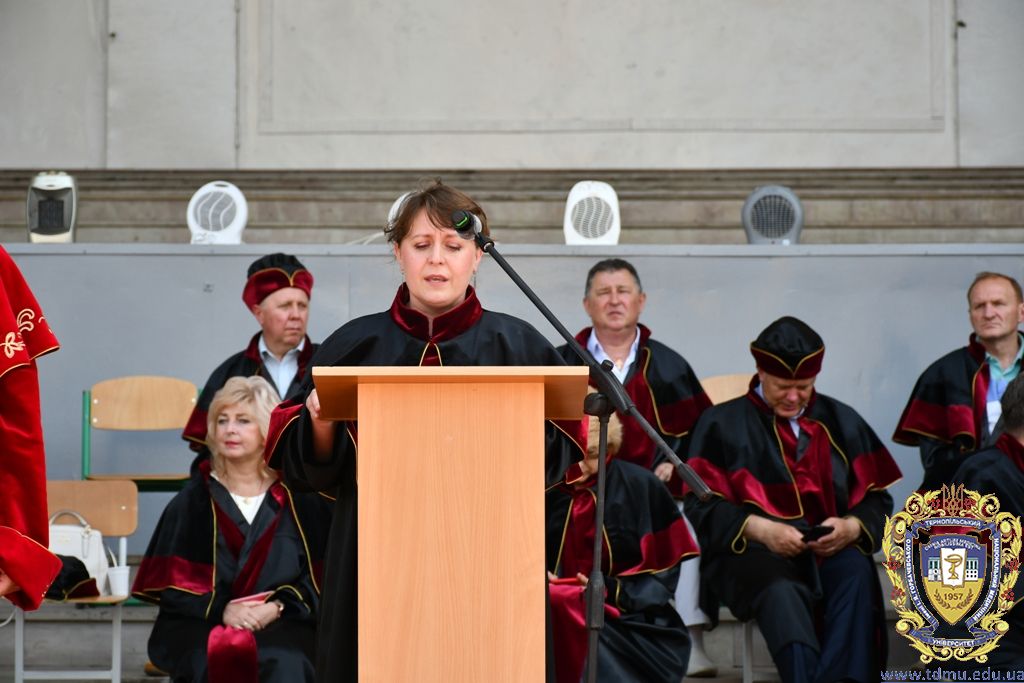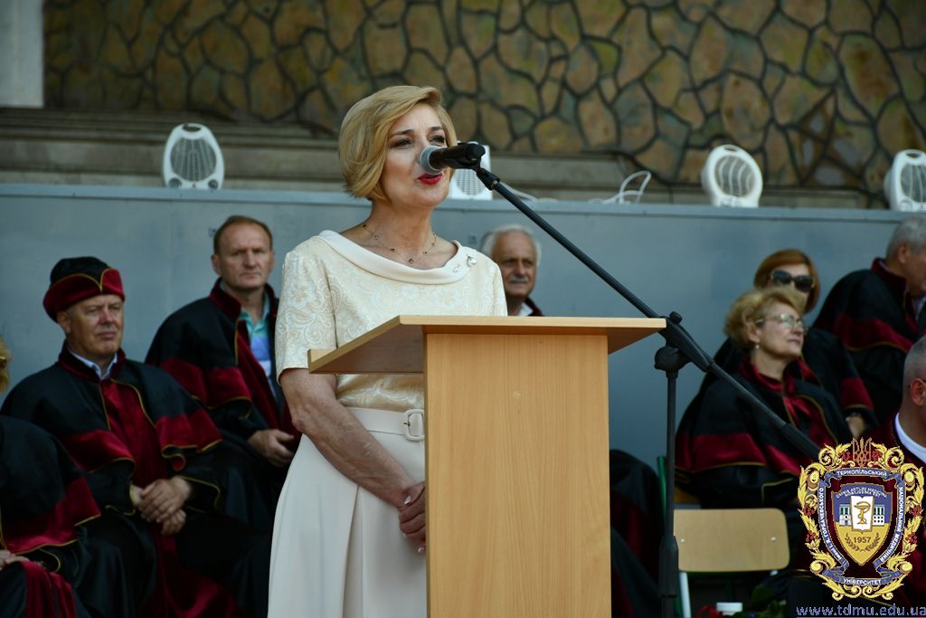 Директор департамент охорони здоров’я ТОДА Ольга Ярмоленко подякувала випускникам ТНМУ за те, що вони обрали медицину. На її думку, треба бути справді відважною особистістю, щоб працювати в медичній галузі. Ольга Маркіянівна наголосила на тому, що робота лікаря передбачає постійний розвиток і вміння бути чуйними.