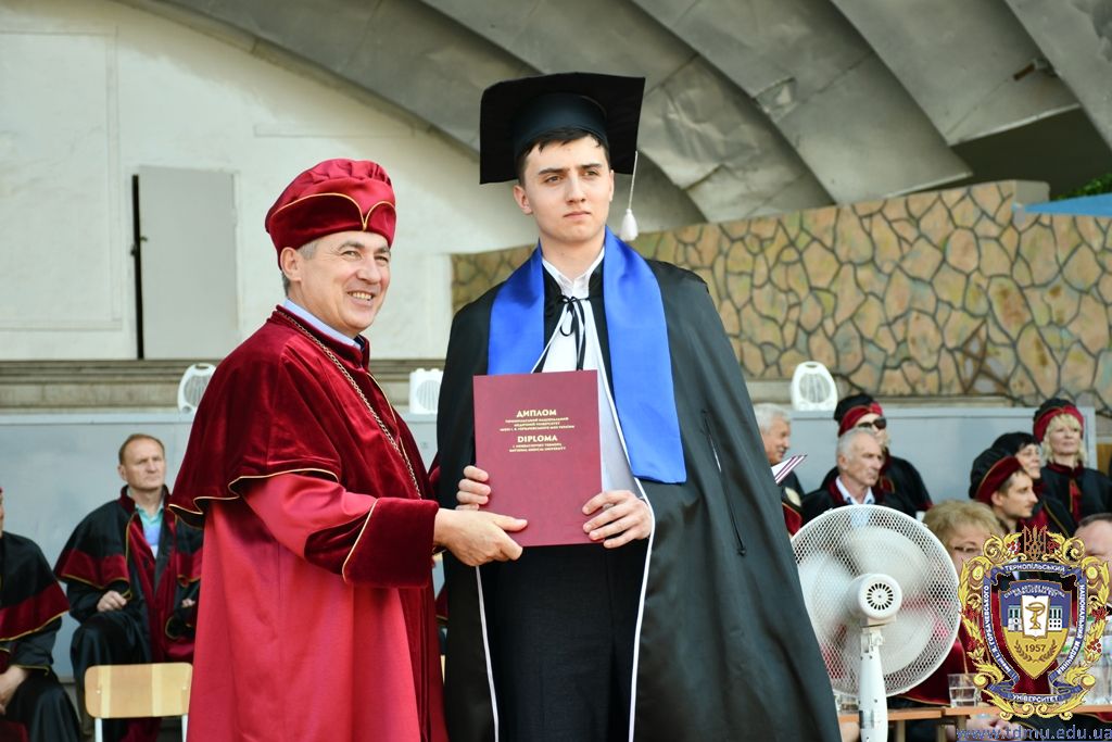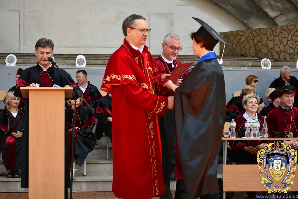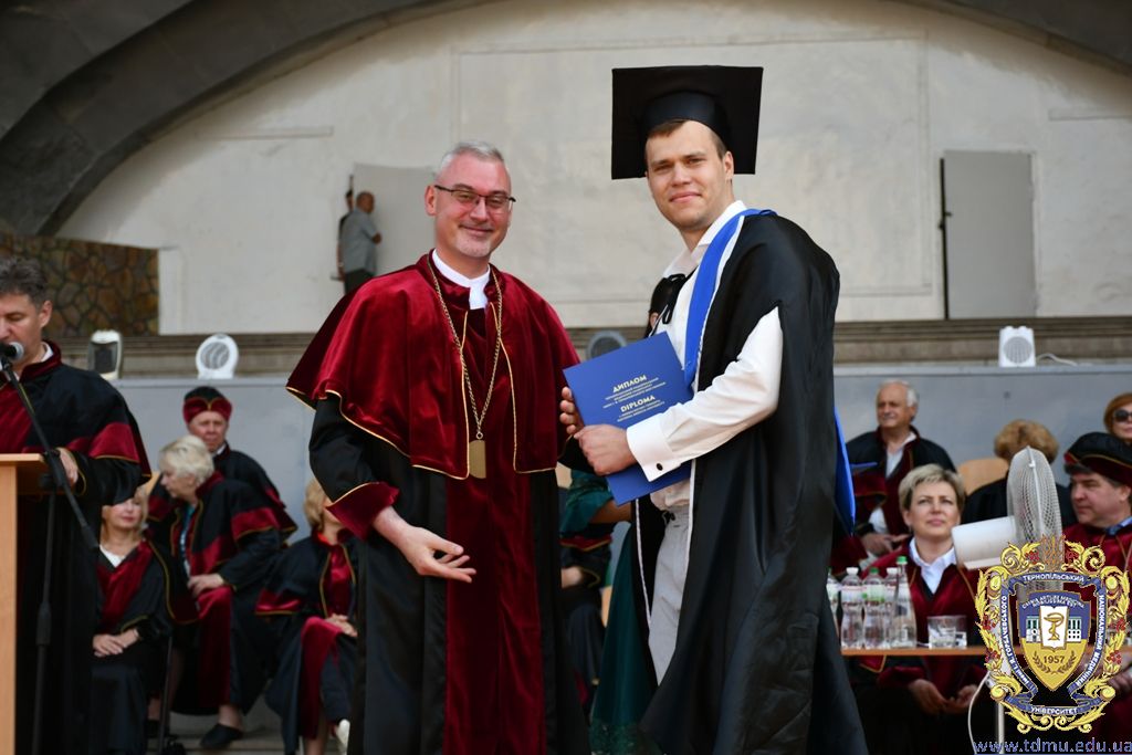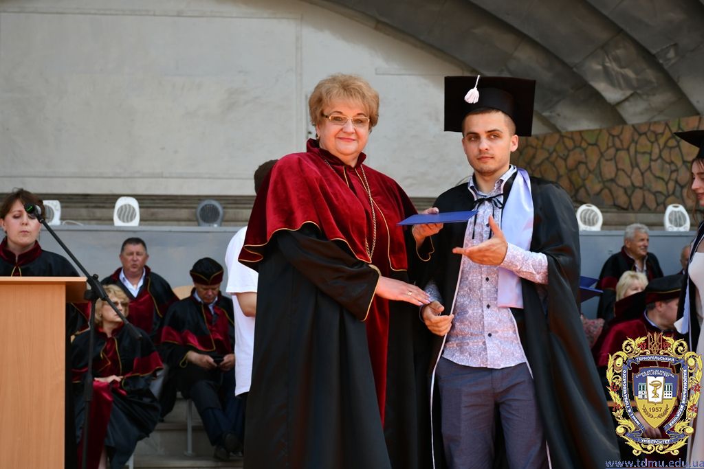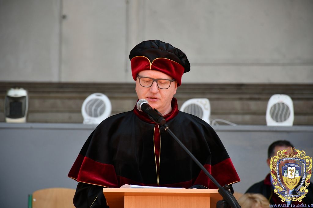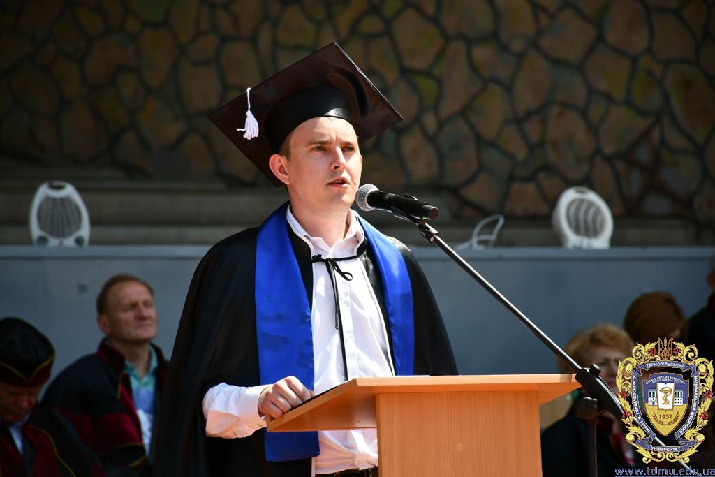 «Від імені вченої ради і професорсько-викладацького складу університету вітаю вас з цією знаменною подією у вашому житті. Сьогодні ви отримуєте квиток у самостійне майбутнє. Перенесіться подумки на хвилину на 5-6 років назад. Згадайте заповнену щасливими посмішками нових студентів нашого університету урочисту залу Палацу культури «Березіль». Вони щойно пройшли посвяту і матрикуляцію. Тоді вам здавалося, що навчання буде довгим і тривалим. Погодьтеся, що цей час промайнув дуже швидко. Тепер згадайте найкращі моменти вашого студентського життя, в якому були не тільки лекції, іспити, а й багато яскравих моментів – нові зустрічі, знайомства, відпочинок, подорожі. Студентство – це найкраща пора в житті кожної людини, це особливий стан душі, найкращий час для самореалізації і самовизначення, реалізації своїх мрій. Переконаний, що ви ще не один раз будете згадувати з ностальгією і приємністю час, проведений в Тернопільському медичному університеті. Багато моментів з цього студентського життя ви втрачаєте назавжди, але з іншого боку цей день є радісним, бо він дає світло надії і радість зустрічі з майбутнім. Сьогодні – це той момент, коли ви вступаєте на свою широку і незалежну життєву дорогу.
