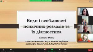 15 липня 2021 року викладачі кафедри психіатрії, наркології та медичної психології взяли участь в онлайн-семінарі «Особливості спілкування та надання соціальних послуг особам, які страждають на психічні розлади».