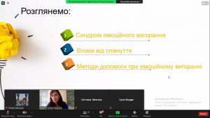 Також під час семінару свою доповідь на тему «Причини та симптоми професійного вигорання» представила кандидат психологічних наук, асистент кафедри Тетяна Павлівна Гусєва, розповівши учасникам про види вигорання та методи допомоги при емоційному вигоранні.