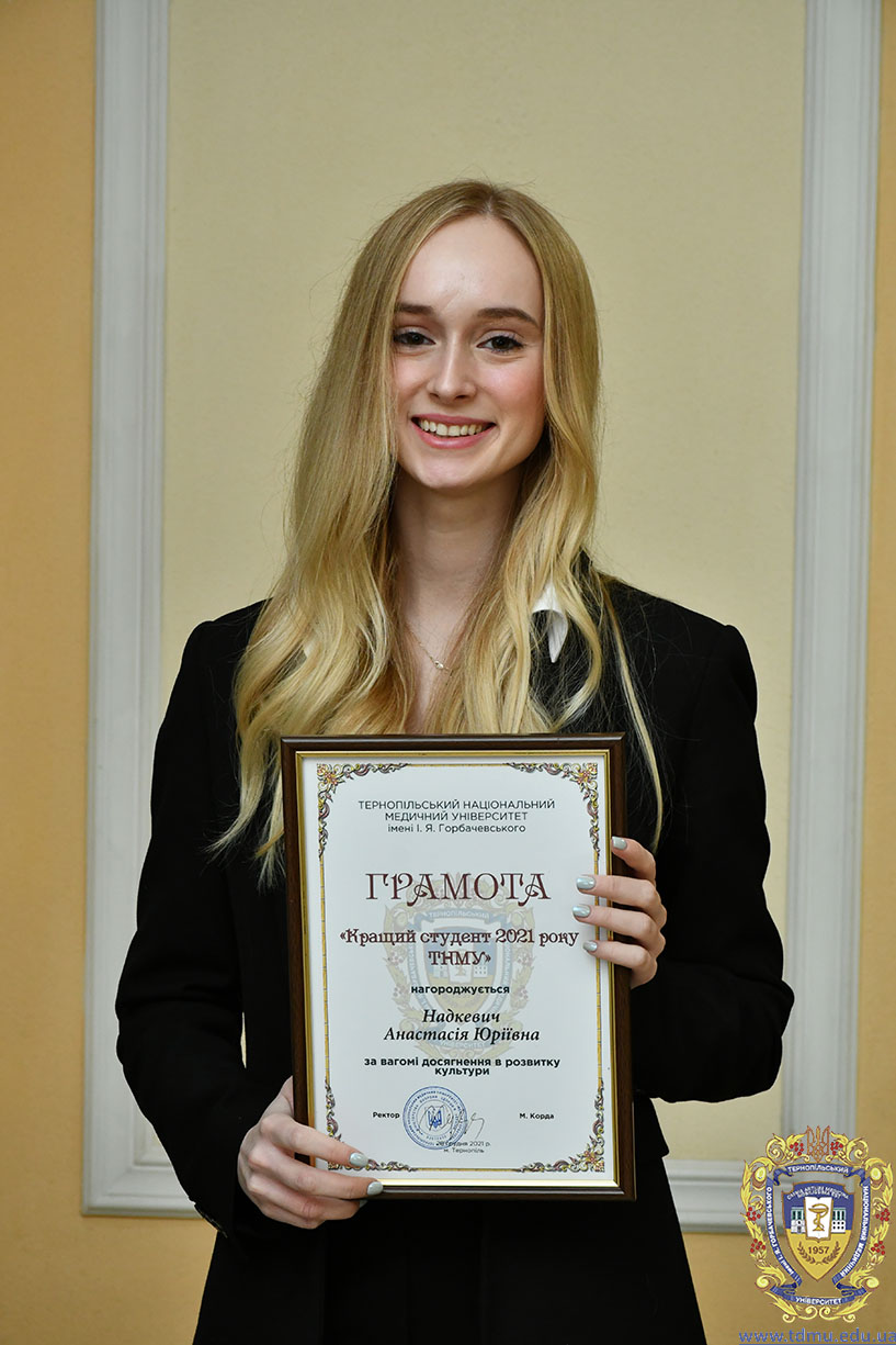 У номінації «За вагомі досягнення в розвитку культури» відзначили Анастасію Надкевич (ММ-311) – членкиню ГО «Інститут досліджень національної спадщини» та науково-краєзнавчої студії «Терполяни». Впродовж 2021 року вона була організатором, співорганізатором та учасником майже 30 громадських заходів.