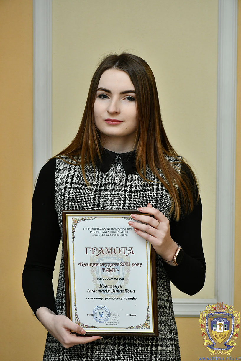 У номінації «За активну громадянську позицію» переможцем обрано Анастасію Ковальчук (СС-404) – представницю стоматологічного факультету в складі «Комісії з питань покращення якості освіти» в ТНМУ, засновницю та першого віце-президента ГО «Студентська ліга Тернопільщини». Дівчина брала участь у конкурсі «Оскар молодіжної роботи», у якому здобула перемогу в номінації «Розвиток студентської молоді» (https://ternopilcity.gov.ua/news/50149.html); перемогла в конкурсі «Громадський бюджет 2021» та «Громадський бюджет 2022». Упродовж 2021 року отримала подяку від міського голови за активну громадську діяльність, життєву позицію, вагомий особистий внесок у реалізації державної молодіжної політики у Тернопільський міській територіальній громаді та з нагоди Дня молоді; подяку за керівництво з комунікації в ГО «ЛСТ» проєктів Громадського бюджету «Літня сцена» та «StudLab»; подяку за розробку, реалізацію та подання до «Громадського бюджету 2021» проєкту «Освітньо-інформаційний простір»; подяку за допомогу та підтримку у перемозі в конкурсі «Громадська організація року».