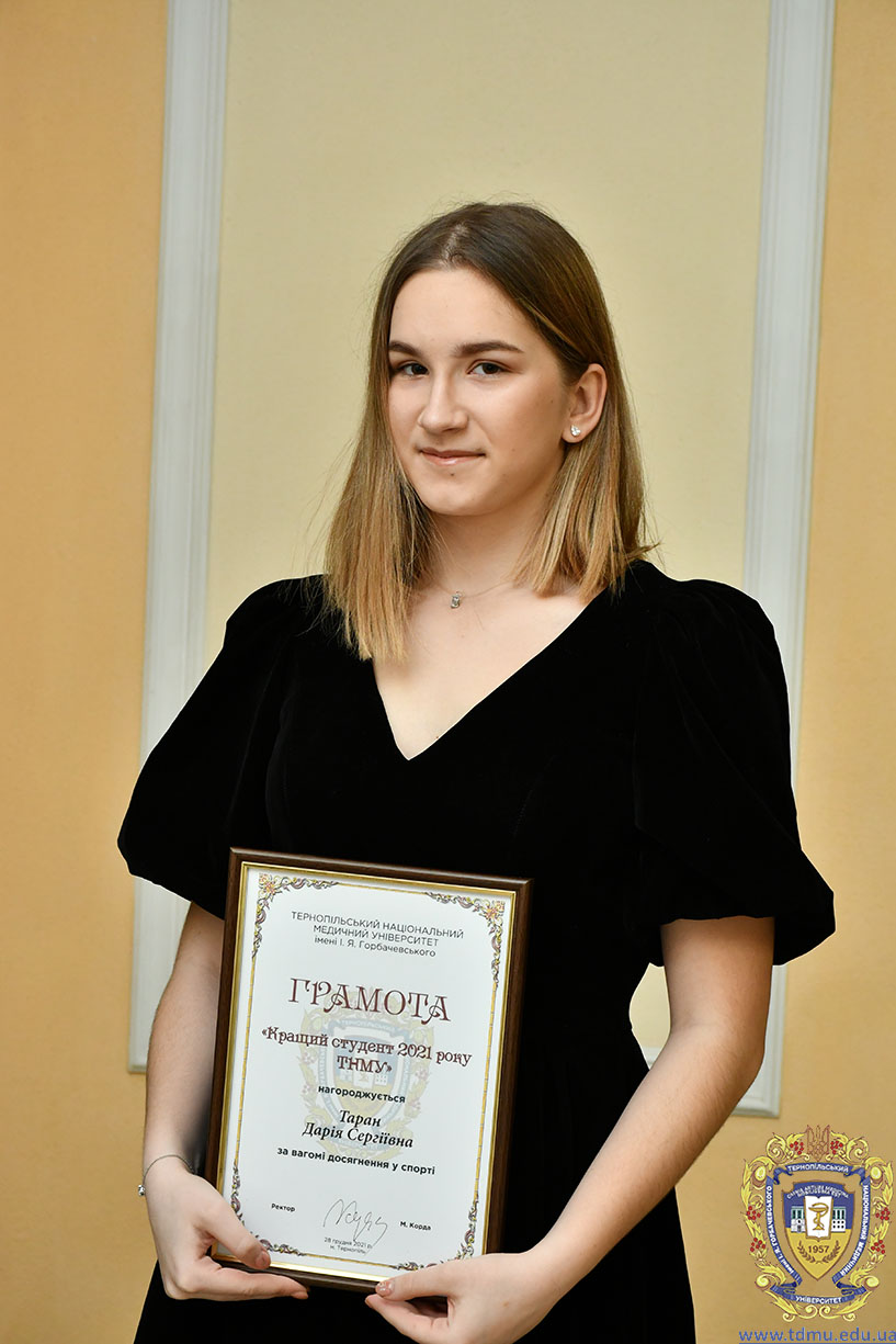 «За вагомі досягнення у спорті» відзначено Дарію Таран (ММ116), яка здобула перше місце у номінації Disco Dance Freestyle Solos Female Adults під час IDO World Disco Dance Cup (Кубок Світу) (30-31.10.2021 м. Фолоніка, Італія); 1 місце – Slow Duo Adults, 1 місце – Disco Dance Freestyle Solo Female Adults, 2 місце – Disco Dance Duo Adults, 4 місце – Slow Solo Female Adults на ХVI Ukrainian Dance Olympiad (Чемпіонат України) 04.12.2021; 2 місце – Disco Freestyle Open Adults під час Nordic Grand Prix 2021 (10-12.12.2021 м. Катерінхольм, Щвеція).