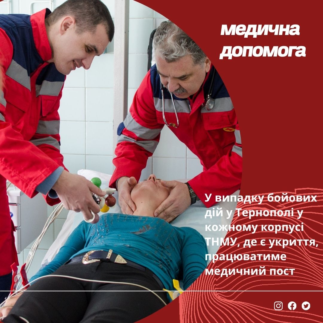 У випадку бойових дій у Тернополі в кожному корпусі Тернопільського національного медичного університету, де є укриття, працюватимуть медичні пости. На них досвідчені фахівці надаватимуть медичну допомогу.