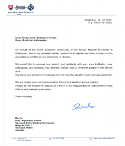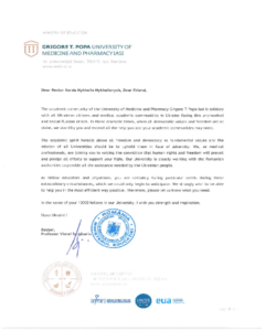 The academic spirit heralds above all freedom and democracy as fundamental values and the mission of all Universities should be to uphold them in face of adversity. We, as medical professionals, are joining you in voicing the conviction that human rights and freedom will prevail and pledge all efforts to support your fight. Our University is closely working with the Romanian authorities to provide all the assistance needed by the Ukrainian people.