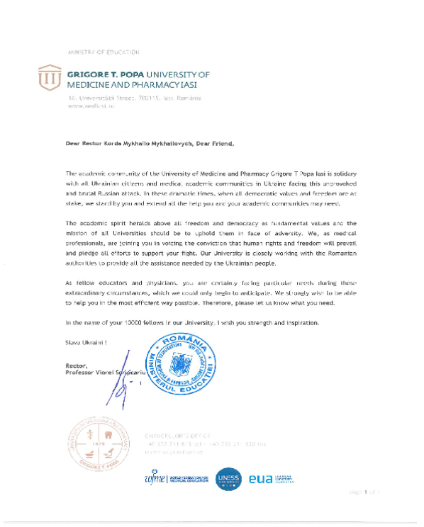The academic spirit heralds above all freedom and democracy as fundamental values and the mission of all Universities should be to uphold them in face of adversity. We, as medical professionals, are joining you in voicing the conviction that human rights and freedom will prevail and pledge all efforts to support your fight. Our University is closely working with the Romanian authorities to provide all the assistance needed by the Ukrainian people.