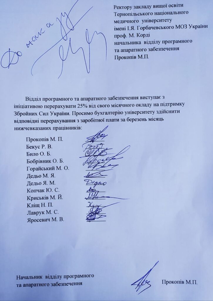 Працівники відділу програмного та апаратного забезпечення Тернопільського національного медичного університету перерахували 25% свого місячного окладу на підтримку Збройних сил України. Вони діють за принципом: підтримуй свою армію, щоб не годувати чужу. У такий спосіб працівники ТНМУ докладають зусилля для нашої спільної перемоги. Фінансова підтримка ЗСУ – це добровільна ініціатива працівників цього відділу.
