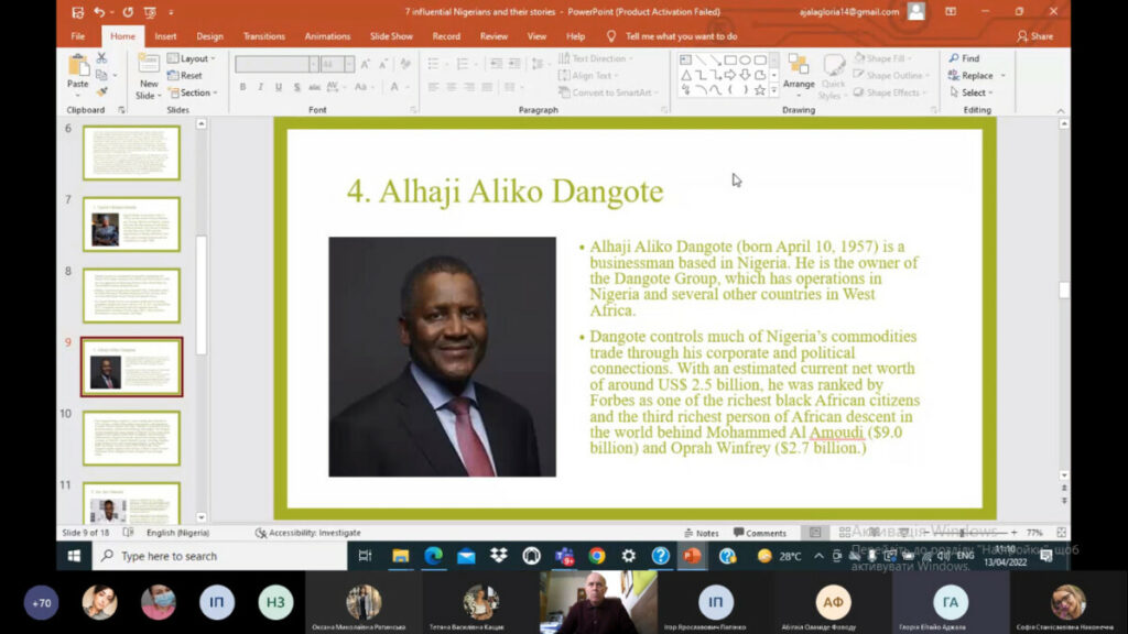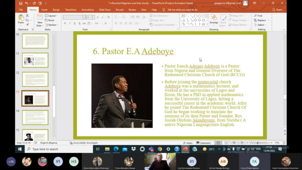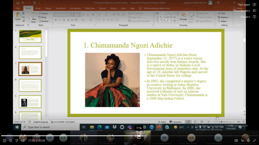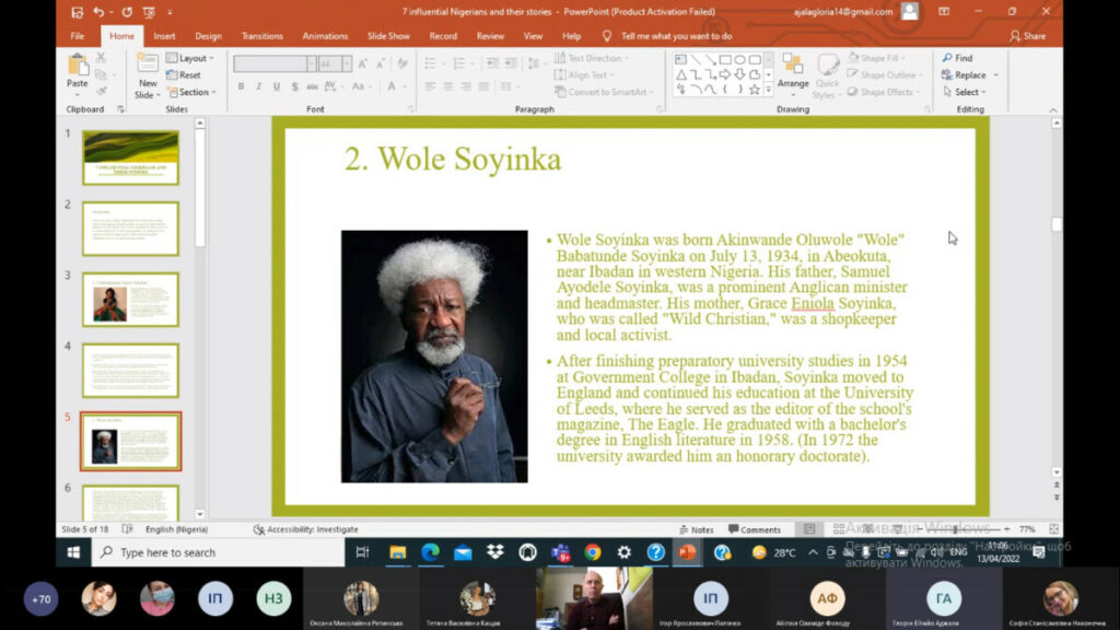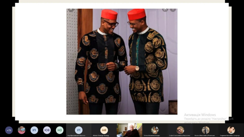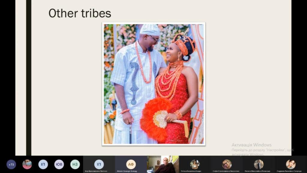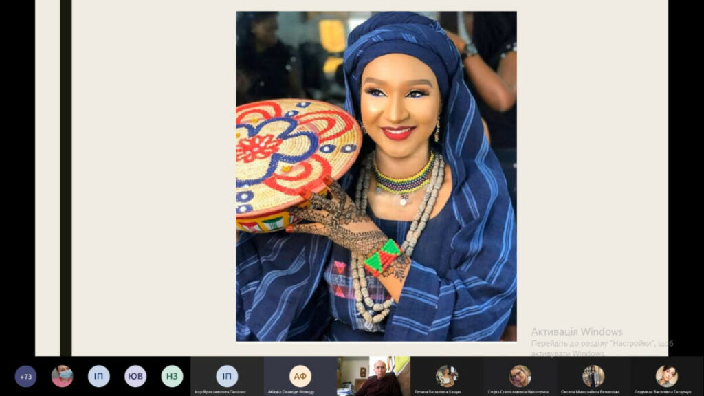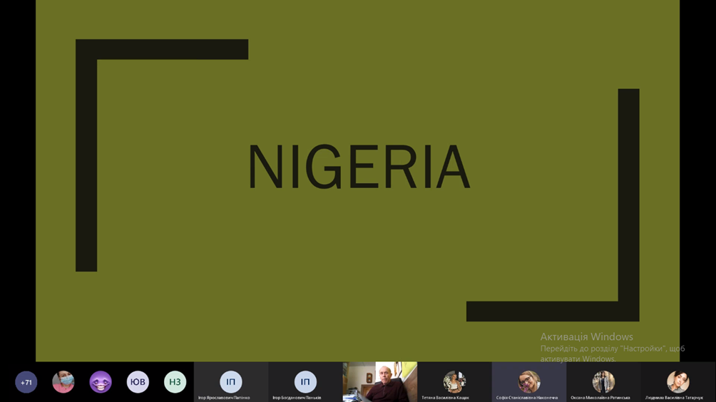 Професорсько-викладацький склад разом із студентами кураторських груп заслухали цікаву презентацію студенток 367-ї кураторської групи Абігаіл Оламіде Фоводу та Глорії Еїтайо Аджали на тему «Нігерія – населення, відомі люди, національні свята».