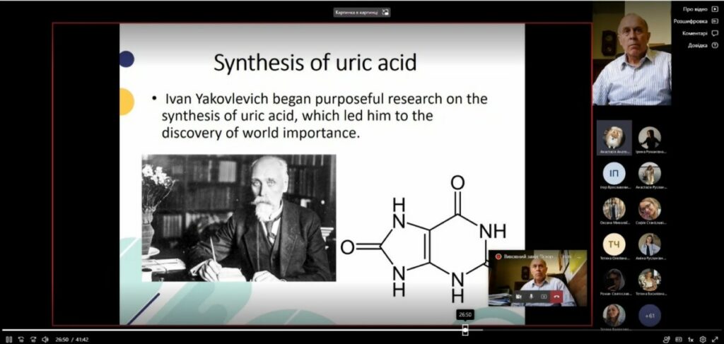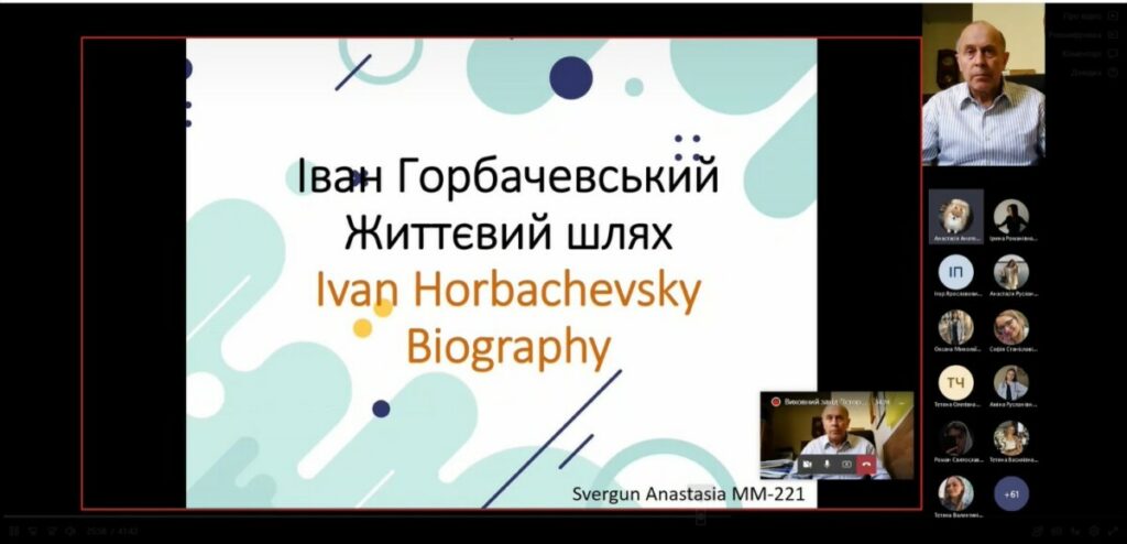 Свергун Анастасія студентка 221 групи медичного факультету розповідала біографію Івана Горбачевського, його життєвий шлях. Його цілеспрямовані дослідження над синтезом сечової кислоти призвели до відкриття світового значення. Пам’ятник українському хіміку, гігієністу та епідеміологу, громадсько-політичному діячеві Іванові Горбачевському встановлений біля морфологічного корпусу Тернопільського національного медичного університету.