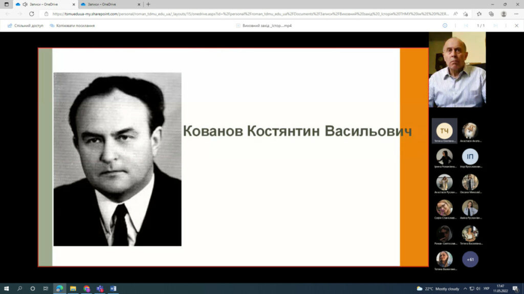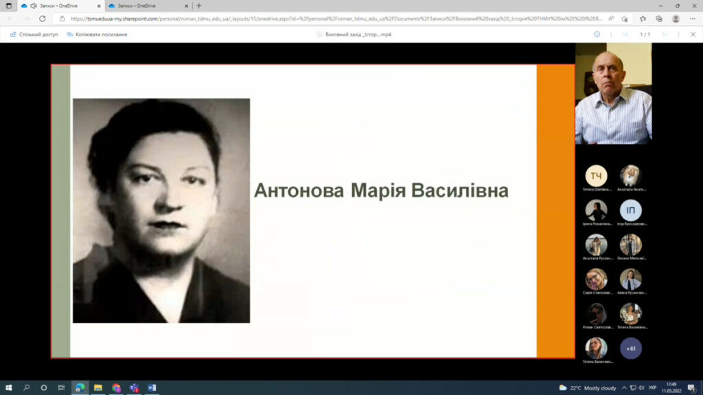 Доповідачка розповідала також про завідувача кафедри нормальної фізіології Кованова К.В., який очолював її з 1957 по 1991роки. Досліджував центральні механізми регуляції судинного тонусу, гемодинамічні функції лімфатичної системи, типи функціональної адаптації серця. Антонову М.В., яка була першим виконуючим обов’язків завідувача кафедри загальної гігієни Тернопільського державного медичного інституту. У 1957-1959 рр. вона разом з працівниками кафедри виконувала актуальну наукову роботу з проблеми оздоровлення навколишнього середовища міста.