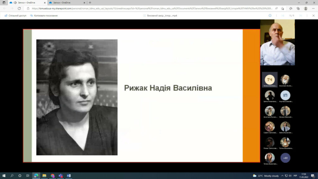 Аудиторія дізналася про Скакуна М.П., який очолював з 1957 р. кафедру фармакології Тернопільського медичного інституту. Він вперше звернув увагу на важливу роль генетичних факторів у дії лікарських засобів на організм, їх токсичності та ефективності при різноманітних захворюваннях. Ініціював вивчення гепато- і ембріотоксичності лікарських засобів та отрут, особливо етилового спирту. Рижак Н.В. керівництво обласного управління охорони здоров’я перевело її на посаду головного лікаря пологового будинку в Тернополі, а в квітні 1953 року призначили обласним акушер-гінекологом, де проявився її хист керівника медичної служби, яку вона очолювала впродовж 27 років. Надія Рижак взялася за створення в районних і дільничних лікарнях пологових відділень та колгоспних пологових будинків, що зумовило повну відсутність пологів вдома. 1964 року Надії Василівні було присвоєно звання «Заслужений лікар України», а 1972 року вона отримала знак «Відмінник охорони здоров’я».