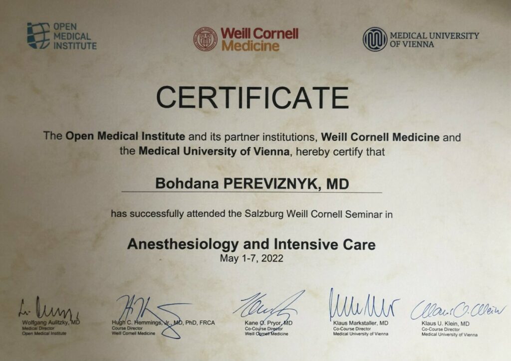 Асистент кафедри медицини катастроф та військової медицини Тернопільського національного медичного університету імені І.Горбачевського Богдана Перевізник взяла участь у семінарі «Anesthesiology and Intensive Care» на базі Open Medical Institute (OMI) у Зальцбурзі (Австрія) з 1 травня 2022 р. по 7 травня 2022 р.
