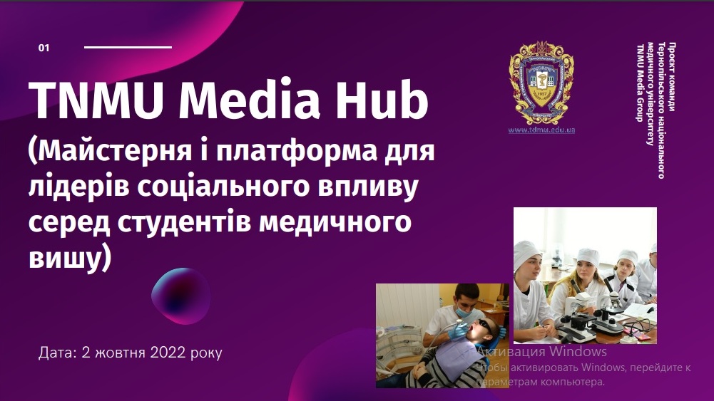 Від Тернопільського медуніверситету учасники представили проект «TNMU Media Hub» у номінації соціальний вплив (social impact) і успішно пройшли 4 етапи відбору. Спершу потрібно було представити свою команду в оригінальний спосіб, створивши фото колаж. Потім учасники надіслали презентацію проекту з обгрунтованням його актуальності, визначенням цільової аудиторії і баченням щодо втілення. Півфінальним конкурсом було представлення і захист проєкту. З цим добре справилася капітан команди Софія Берегуляк. 15 жовтня 2022 року представники ТНМУ отримали листа, в якому організатори повідомили про потрапляння команди «TNMU Media Group» до фіналу. Призом за всі старання буде навчання одного з представників або наставника команди на онлайн курсі Школи з написання грантових проєктів «ЧАС ЗМІН».