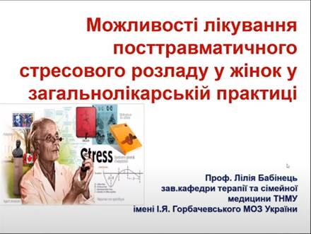 Продовжила пленарне засідання д-р мед. наук, професор, завідувач кафедри первинної медико-санітарної допомоги та загальної практики сімейної медицини ТНМУ Бабінець Лілія Степанівна, з доповіддю про можливості лікування посттравматичного стресового розладу у жінок в загальнолікарській практиці. Пізніше доповідачка також презентувати для аудиторії інформацію про коморбідність у практиці сімейного лікаря.