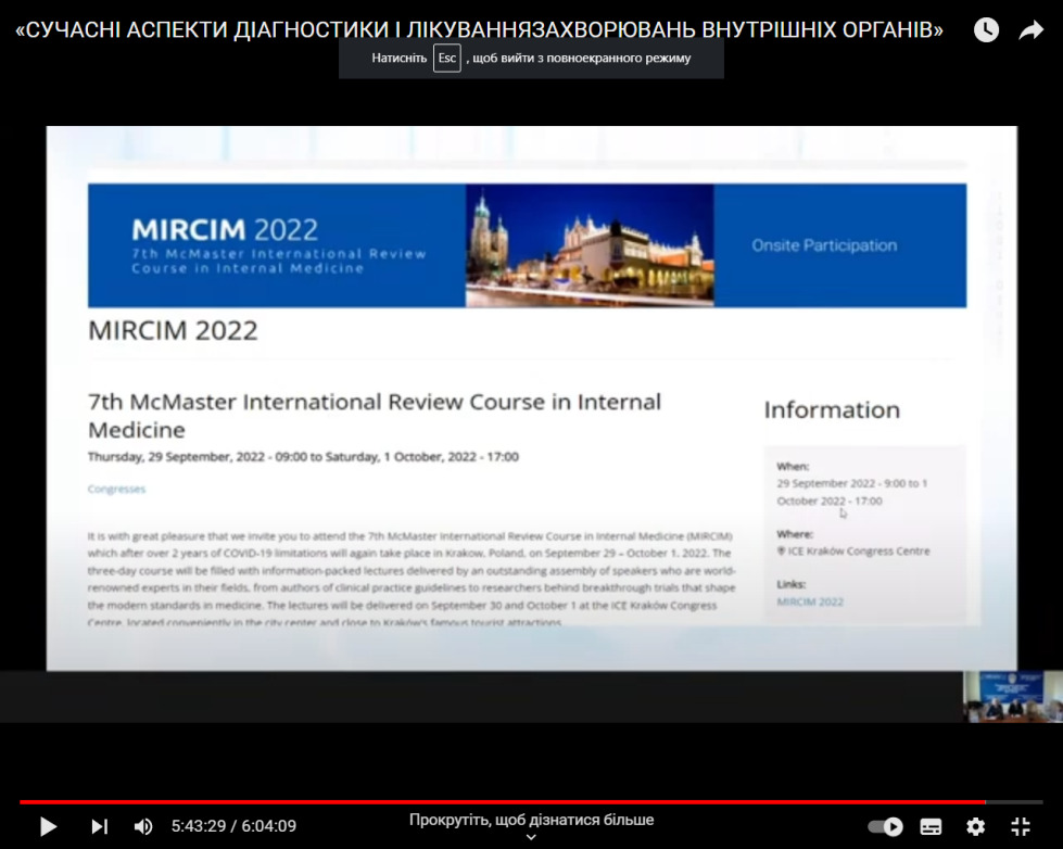 Бількевич Наталія Антонівна, кандидат медичних наук, доцентка кафедри пропедевтики внутрішньої медицини та фтизіатрії ТНМУ презентувала диференційні підходи до діагностики і лікування кашлю у практиці лікарів, а також представила інформацію щодо тематики сьомого міжнародного навчального курсу з внутрішньої медицини McMaster International Review Course in Internal Medicine (MIRCIM), який відбувся у Кракові, Польща, 29 вересня-1 жовтня 2022 р. Вона також нагадала аудиторії, що сучасні протоколи діагностики й лікування внутрішніх органів можна знайти у підручнику “Внутрішня медичина, заснована на доказах”, виданого Мак-Мастерським університетом, Канада, та перекладеним українською за сприяння Польського інституту доказової медицини та видавництва “Медицина практична”, а також, що даний підручник та багато іншої корисної інформації є у широкому доступі на сайті “Empendium” цього видавництва.