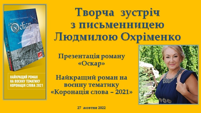 У бібліотеці ТНМУвідбуласязустріч з українською письменницею, волонтеркою Людмилою Охріменко та презентація роману «Оскар», за який авторка отримала спеціальну відзнаку Міжнародного літературного конкурсу «Коронація слова — 2021» за найкращий роман на воєнну тематику.