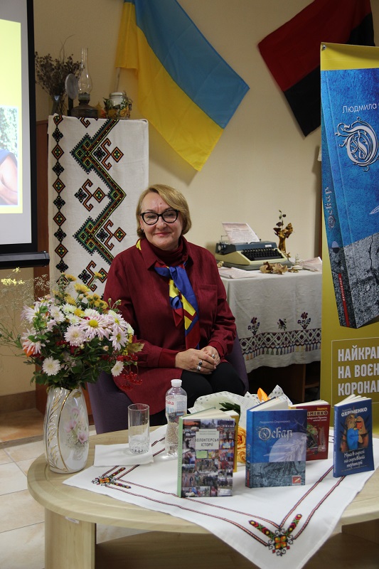 Розповідь письменниці про роман «Оскар», визнаний кращим романом на воєнну тематику у 2021 році, вразила всіх присутніх. Адже «жива» та змістовна розповідь пані Людмили про головного героя з позивним Оскар – це доля справжнього воїна-розвідника, що воює за Україну. Історія появи роману — особлива і непередбачувана. «До мене, як до волонтерки, часто звертаються військовослужбовці, — розповіла пані Людмила. — Так трапилося і цього разу. Я відкрила фейсбук і побачила повідомлення від людини в однострої: «Мені дуже потрібна ваша допомога!». Згодом з’ясувалося, що військовий звернувся до письменниці з проханням написати книжку, про його долю, службу, полон… «Я прочитала його розповідь, запропонувала пробну главу, і ми дійшли згоди, бо мене зацікавила його історія, а йому сподобався мій художній стиль і відчуття слова», — продовжує пані Людмила.